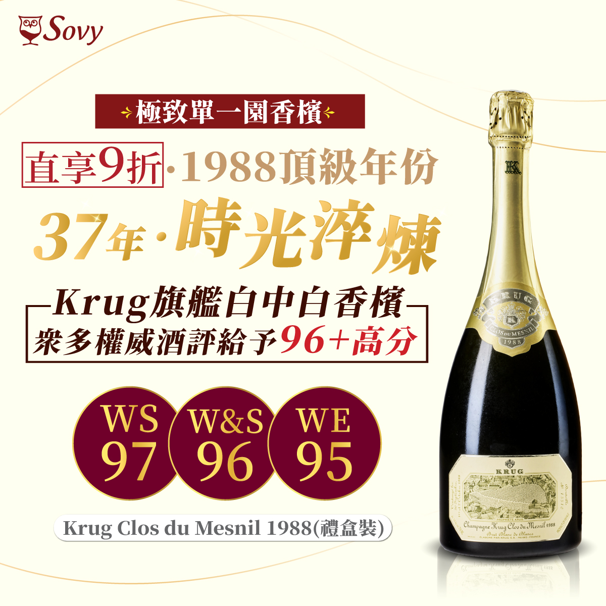 【Krug Clos du Mesnil 1988︱極致單一園香檳】 經過37年時光淬煉的白中白「Krug白鑽香檳」市面幾乎難再遇的珍稀年份,配上精緻原箱木盒,不論送禮還是收藏,都是一個無法抗拒的奢華選擇。 🍾單品直享市場最低價!只需 NT$ 83,640! ▌1988年是八九十年代頂級年份之一,多位權威酒評家給予95分以上的高分, Krug Clos du Mesnil 1988被譽為「香檳界傳奇」以其非凡的豐富度、精緻度和陳年能力聞名,至今超過37年仍能展現驚人活力與複雜度。 外國酒評網站CT 酒友滿分好評 : ▌這是我最棒的香檳!入口細膩,天鵝絨般順滑。開瓶後酒體逐漸增強,依然保持著細膩,餘韻悠長以及帶有茉莉和柚子的香氣~